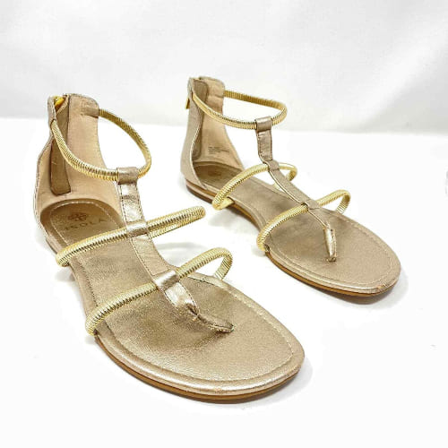 A strappy flat sandal with braided ankle ties and metallic toe-loop detail, offering a boho-chic, comfortable summer classic.